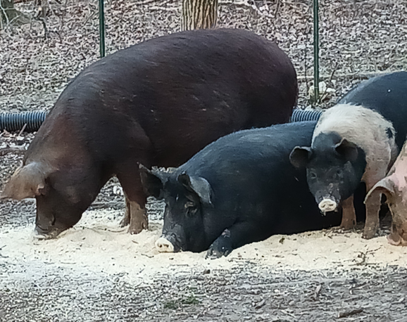 We love raising our pigs in the most natural and healthy environment possible. This enables us to provide tasty pork, with better flavor and freshness available from factory farms. Our pigs root and wallow in the forested areas of our farm, enjoying acorns, roots, plants, insects, and rummage on cover crops like clover and squash we plant for them. They are supplemented with custom-mix feed to keep them healthy and happy. Keeping them active with room to roam and exercise means a leaner meat. We don’t rush them to the butcher.