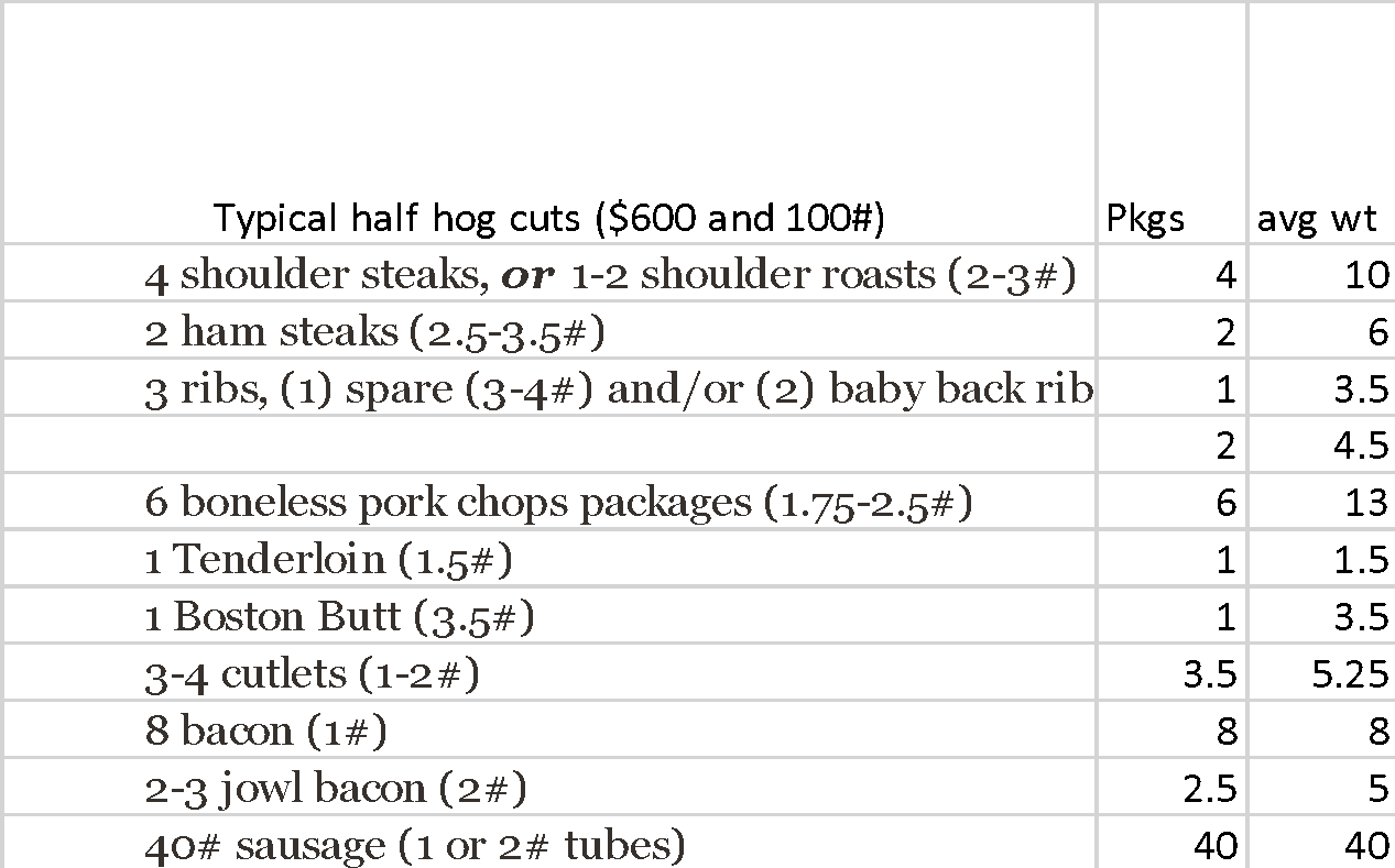 A typical half hog “take home” averages 100# of meat and typically includes: